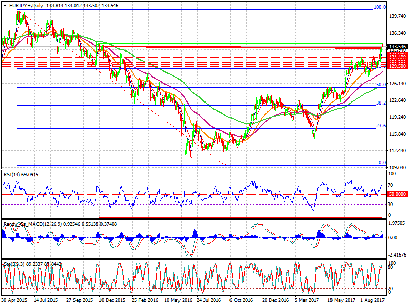 September 20, 2017EUR/YEN Update – 20/09/2017 (11:55am): EURJPY still in an uptrend.. EUR/JPY has reached the 134.32/61.8% of the move down from 2014 and initial target for the upmove. We would allow for this to hold the initial test. We note the 13 count on the 240 minute chart. Provided that the uptrend at 130.70 contains the down side the longer term up move will remain intact. Above here would target the 1979-2017 resistance line at 139.12. Intraday dips will find some support offered by the 131.90 end of August high.