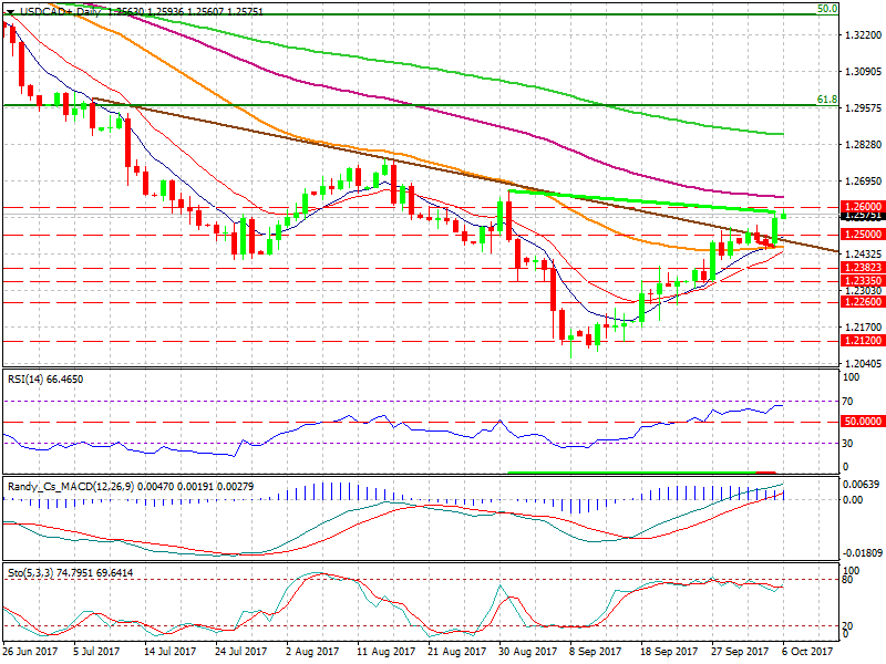 October 6, 2017USD/CAD Update – 06/10/2017 (10:50am): USDCAD could be interesting today… USDCAD surged 60 points yesterday on weak Canada trade data (Intl merchandise balance -3.41bn vs. -2.60bn c/f) before continuing to kick on during the New York session to make new highs of 1.2591, with a broader stronger USD driven by US FI sell off and NAFTA headlines: *U.S. `SOMEWHAT DISAPPOINTED’ WITH NAFTA TALKS SO FAR: PERDUE. In focus today will be US and Canada jobs reports: barring any major surprises in payroll numbers (which will be somewhat distorted by hurricane effects) many now expect wage growth to drive CAD price action, with Barclays research anticipating a slight uptick from Aug figure of 1.8% YoY given the continued strength of the economy. Support comes in at 1.2540 (prev high) ahead of trendline at 1.2450, resistance at 1.2660 ahead of 1.2780.